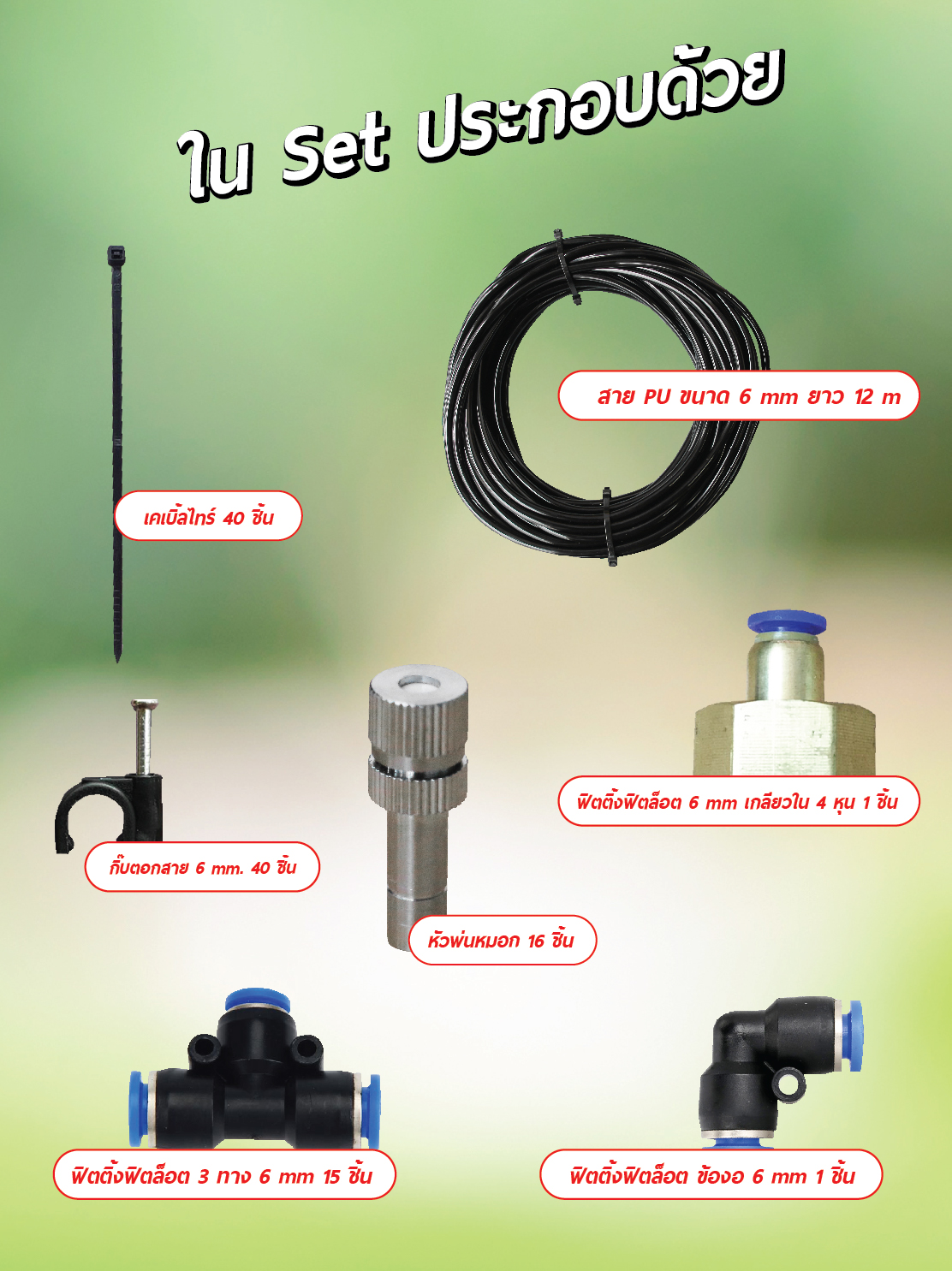 ใน set ประกอบด้วย- หัวพ่นหมอก 16 ชิ้น- ฟิตติ้งฟิตล็อต 3 ทาง 6 mm 15 ชิ้น- สาย PU ขนาด 6 mm ยาว 12 m- ฟิตติ้งฟิตล็อต ข้องอ 6 mm 1 ชิ้น- ฟิตติ้งฟิตล็อต 6 mm เกลียวใน 4 หุน 1 ชิ้น- กิ๊บตอกสาย 6 mm. 40 ชิ้น- เคเบิ้ลไทร์ 40 ชิ้น