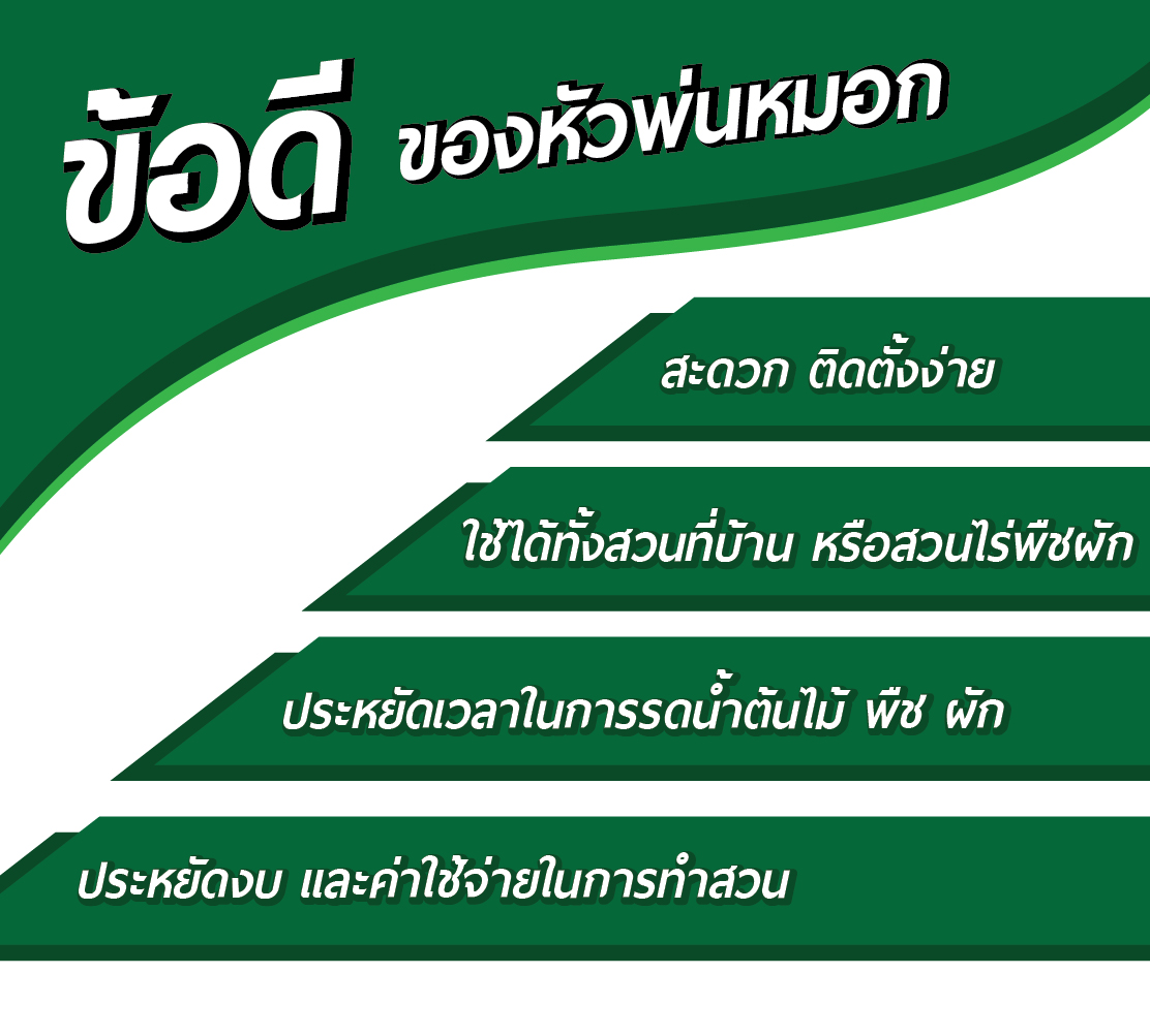 1. สะดวก ติดตั้งง่าย2. ใช้ได้ทั้งสวนที่บ้าน หรือสวนไร่พืชผัก3. ประหยัดเวลาในการรดน้ำต้นไม้ พืช ผัก4. ประหยัดงบ และค่าใช้จ่ายในการทำสวน