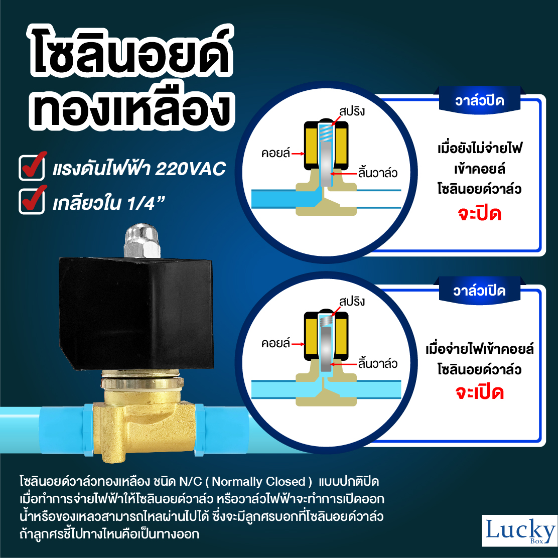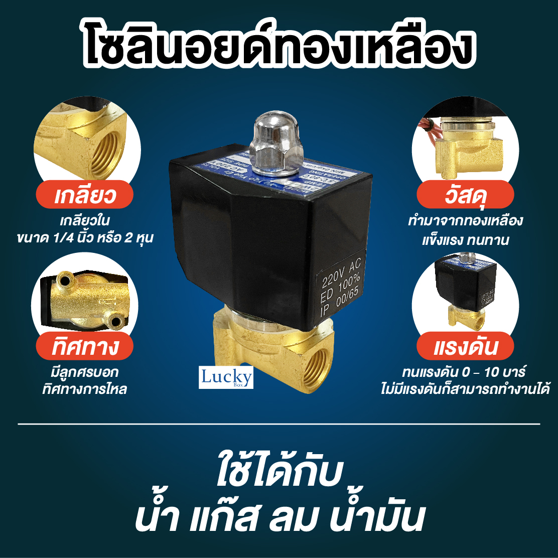 ใช้ได้เฉพาะ น้ำสะอาด ลม แก๊ส น้ำมัน ยกเว้น เบนซิน ควรใช้โซลินอยด์วาล์วสแตนเลส