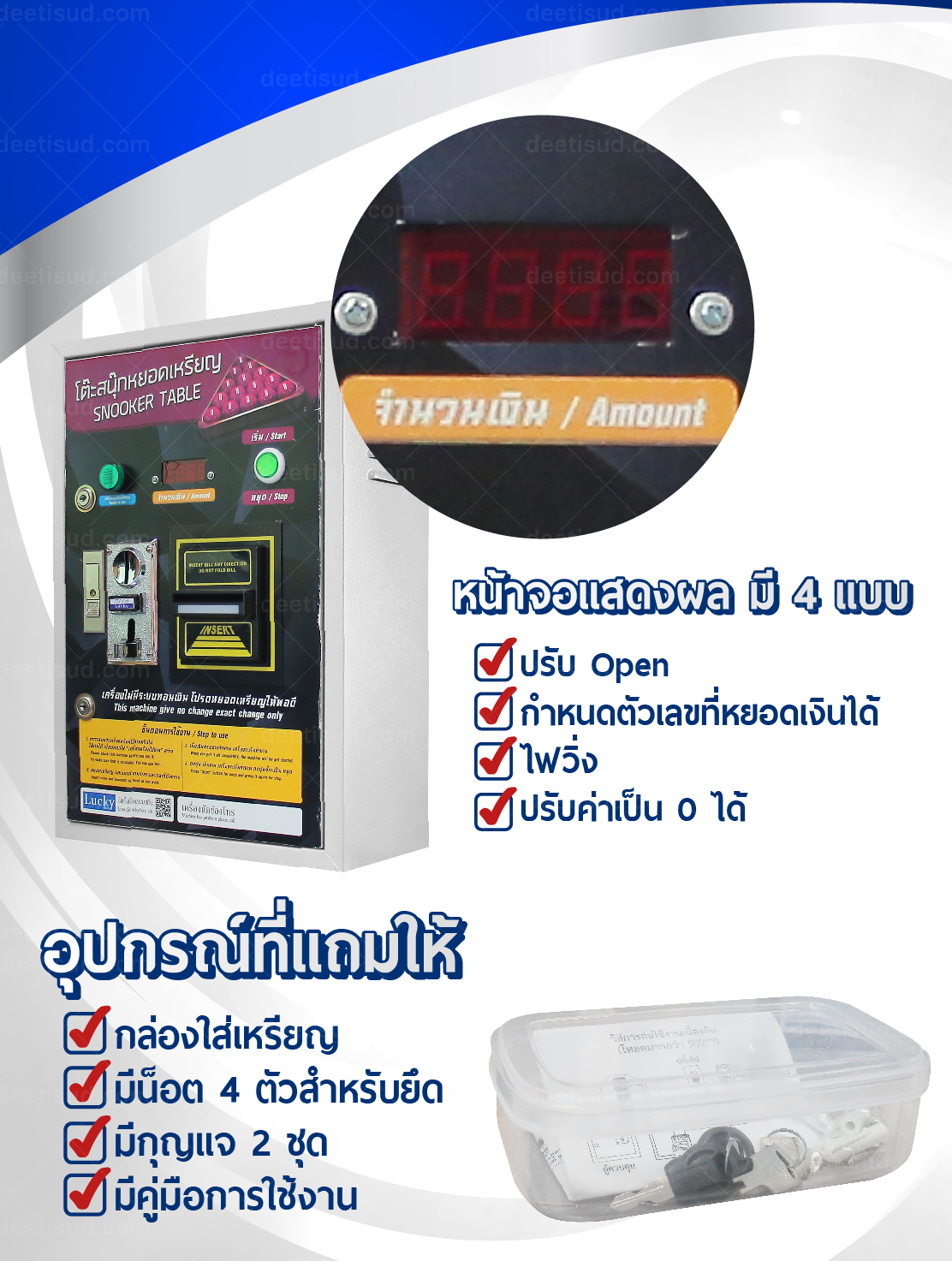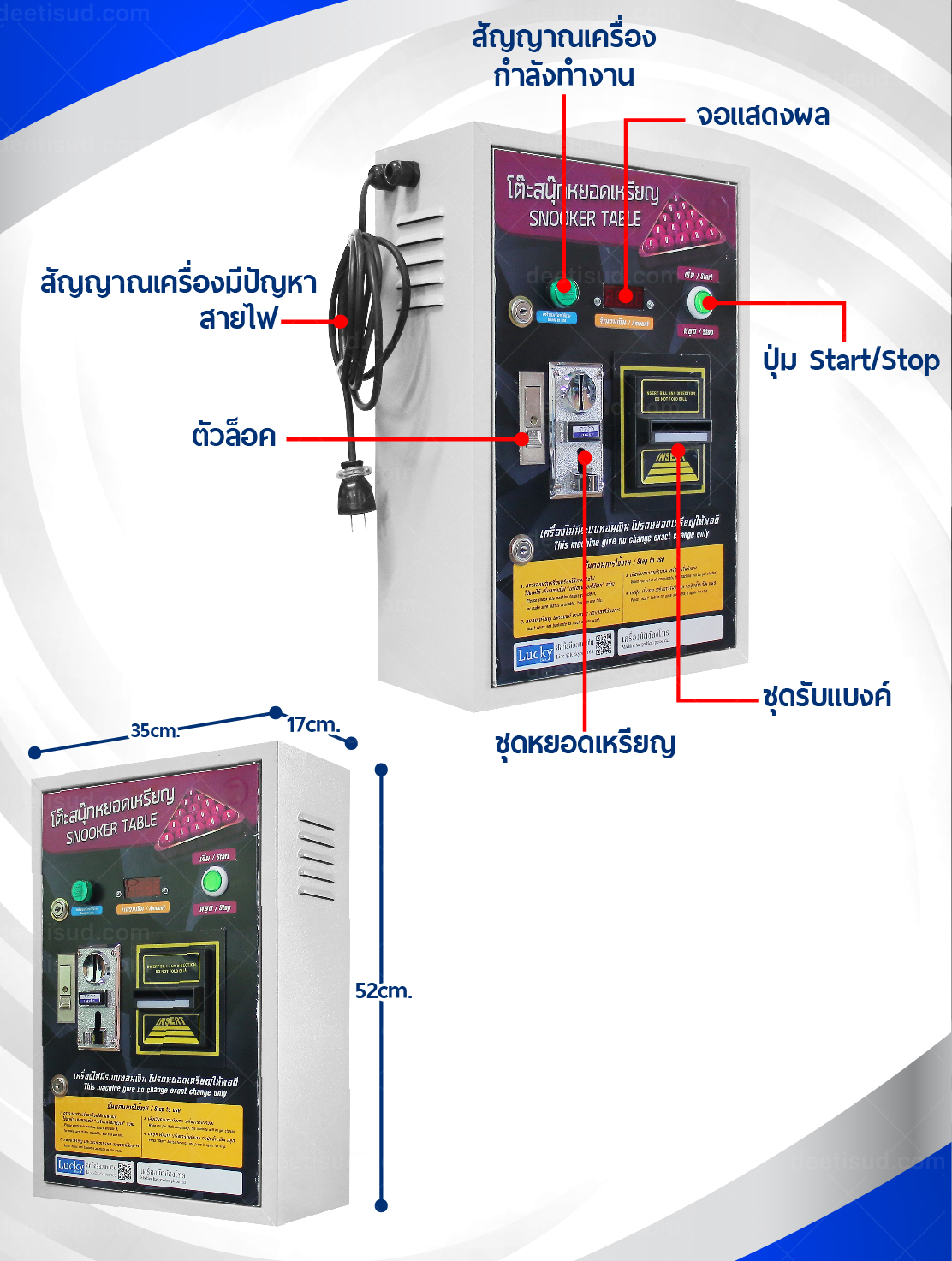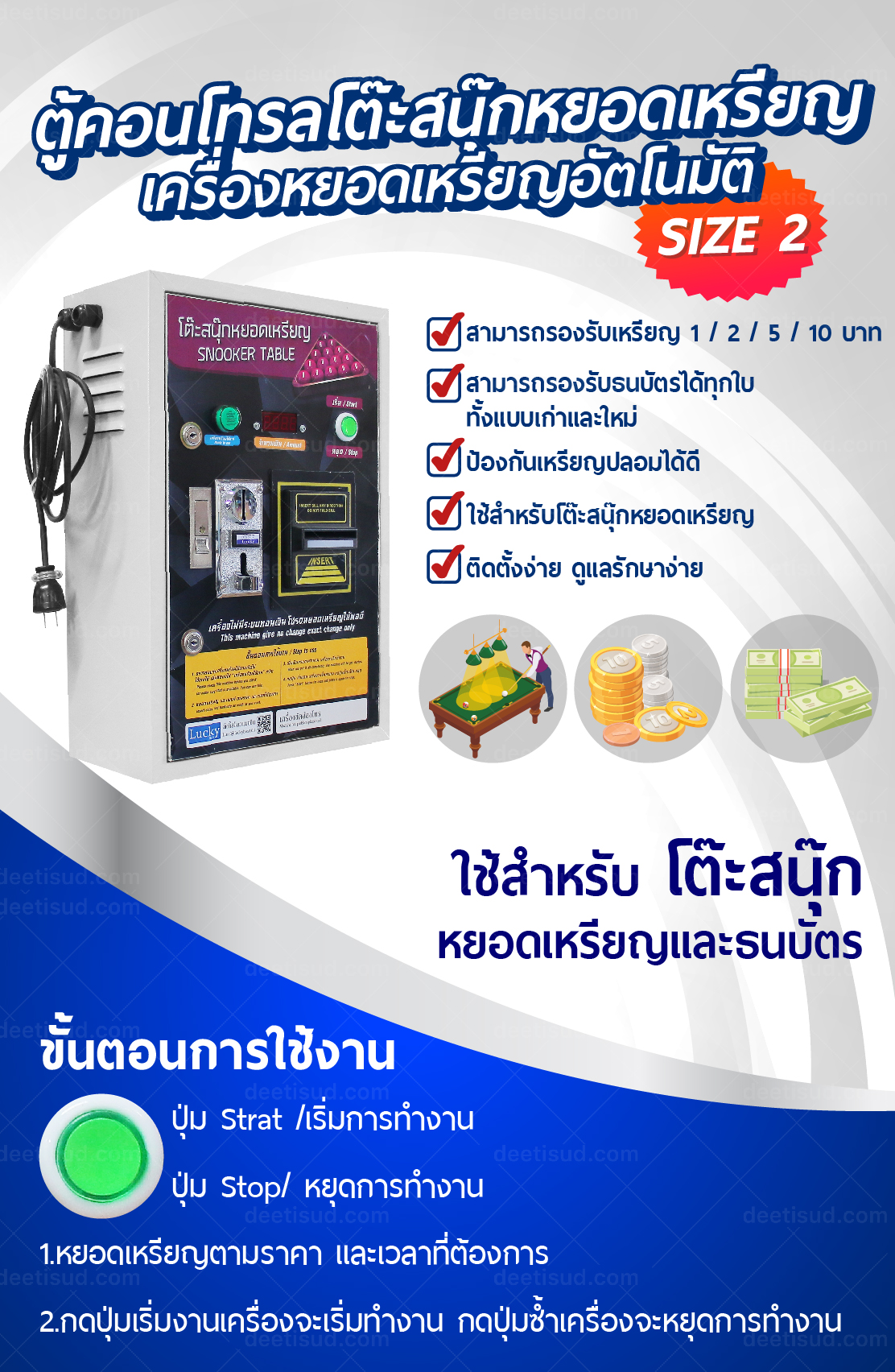 ตู้หยอดเหรียญอัตโนมัติ หยอดเหรียญและแบงค์ Timer จ่ายไฟ สามารถรับได้ทุกเหรียญทุกรุ่นทั้งใหม่/เก่า มีความแม่นยำและระบบป้องกันเหรียญปลอม และสามารถรับได้ทุกแบงค์ทุกรุ่นทั้งใหม่/เก่า มีความแม่นยำและระบบป้องกันแบงค์ปลอมและมีขนาดใช้ได้ในระบบไฟฟ้าในบ้าน เรือนได้ โดยที่ใช้ไฟไม่เกิน 220 โวลต์ ได้ สายไฟยาว 2 เมตร สามารถตั้งค่าได้ตามที่ผู้ประกอบการต้องการ หน้าเครื่องจะบอกสัญาณเครื่องกำลังทำงานขึ้นไฟโชว์ทุกครั้งที่มีการใช้งานหน้าเครื่องจะบอกสัญญาณเครื่องกำลังทำงานขึ้นไฟโชว์ทุกครั้งที่มีการใช้งาน