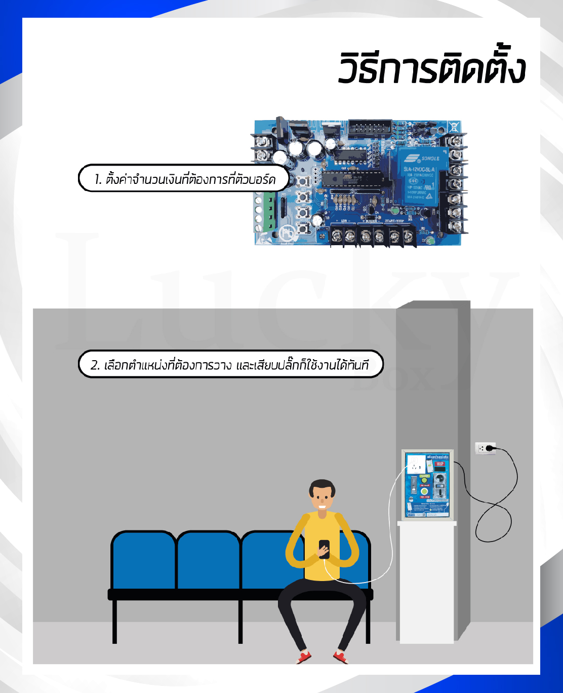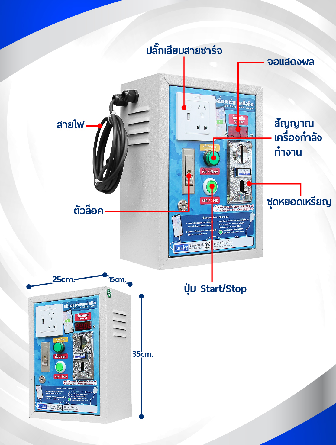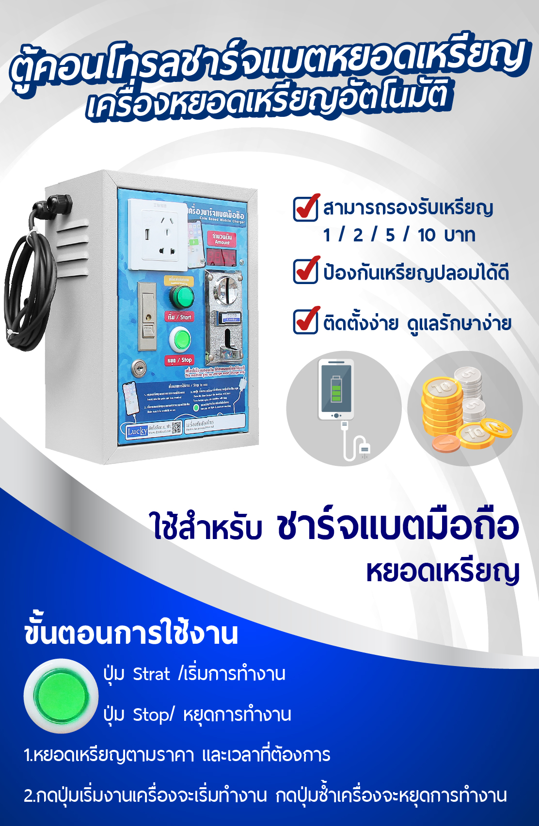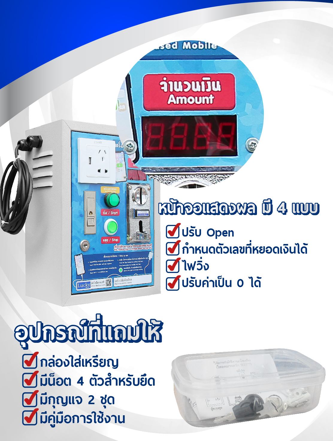 ตู้หยอดเหรียญอัตโนมัติ หยอดเหรียญ Timer จ่ายไฟ สามารถรับได้ทุกเหรียญสามารถรับได้ทุกเหรียญทุกรุ่นทั้งใหม่/เก่า มีความแม่นยำและระบบป้องกันเหรียญปลอม และมีขนาดใช้ได้ในระบบไฟฟ้าในบ้าน เรือนได้ โดยที่ใช้ไฟไม่เกิน 220 โวลต์ ได้ สายไฟยาว 2 เมตร สามารถตั้งค่าได้ตามที่ผู้ประกอบการต้องการ หน้าเครื่องจะบอกสัญาณเครื่องกำลังทำงานขึ้นไฟโชว์ทุกครั้งที่มีการใช้งานหน้าเครื่องจะบอกสัญญาณเครื่องกำลังทำงานขึ้นไฟโชว์ทุกครั้งที่มีการใช้งาน