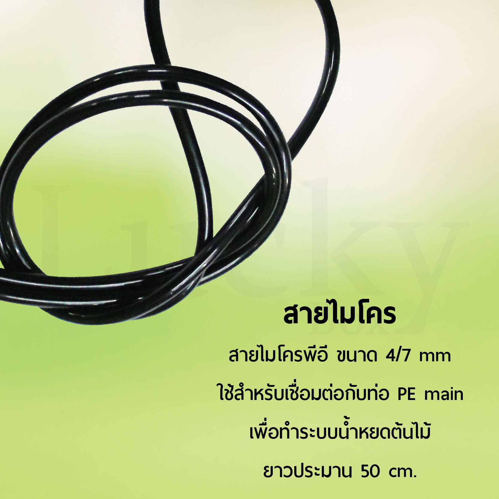 ใช้ที่เจาะท่อ PE ด้านเจาะขนาด 3 มิล เจาะ ในตำแหน่งที่ต้องการ และใส่ตัวต่อ ขนาด 4/7 ลงไปตรงที่เราเจาะ และนำสายไมโคร ขนาด 4/7 เสียบเข้ากับข้อต่อตรง หลังจากนั้น นำ หัวน้ำหยดพร้อมขาปักน้ำหยดแบบงอ 2 ขา มาเสียบเข้ากับ ปลายทางของสายไมโครที่เราทำไว้ แล้วนำขาปัก ไปปักตามตำแหน่งที่ต้องการ ( วิธีการต่อใช้งานแล้วแต่พื้นที่ และ หน้างาน ของแต่ละคนนะคะ )